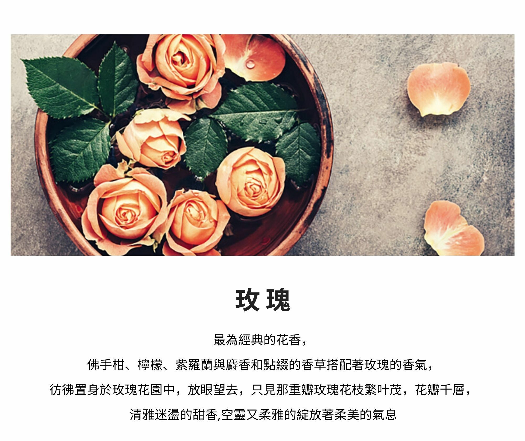 最為經典的花香,佛手柑、檸檬、紫羅蘭與麝香和點綴的香草搭配著玫瑰的香氣,彷彿置身於玫瑰花園中。